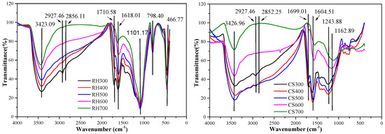Fourier-transform infrared (FTIR) spectra of the biochar samples obtained at various pyrolysis temperatures. Notes: RH300, RH400, RE500, RH600, and RH700 indicate that rice husk were pyrolyzed at 300, 400, 500, 600 and 700 °C, respectively; CS300, CS400, CS500, CS600, and CS700 indicate that cotton straw were pyrolyzed at 300, 400, 500, 600 and 700 °C, respectively.