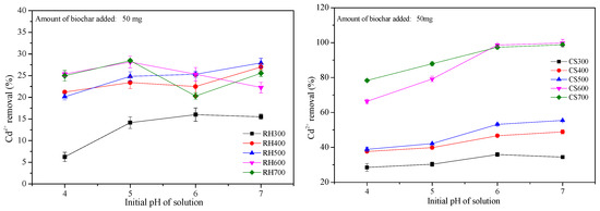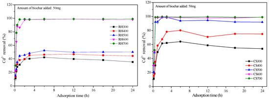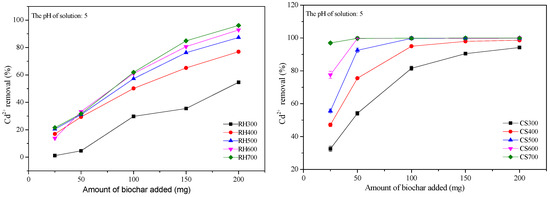 From Figure 3, we can see that, at pH 5, the Cd2+ removal of biochar obtained from both materials significantly increased with additive content. A larger biochar amount provided a larger adsorption surface area and a greater number of Cd2+ adsorption sites. Therefore, the removal increased. The highest Cd2+ removal was obtained with 200 mg of the rice-husk biochar, with RH300 affording the lowest (54.63%) removal, and RH700 the highest (96.12%) removal. For the cotton-straw biochar, the Cd2+ removal was highest for 200 mg of CS300 (94.22%). The Cd2+ removal reached 95% when 100 mg of CS400 and 50 mg of CS 500 were employed. Only 50 mg of CS600 was required to remove nearly 100% of Cd2+ ions, while only 25 mg of CS700 was required to achieve a Cd2+ removal of 99.67%. Therefore, huge differences existed in the Cd2+ adsorption by biochar obtained from both materials pyrolysed at various temperatures [30,31]. Upon comparing the two materials, we can see that a smaller amount of the cotton-straw biochar was required to achieve the same removal in a shorter time. Therefore, from an energy-saving perspective, the conditions to obtain the best adsorption performance involve the use of 150 mg of rice husk biochar pyrolysed at 500 °C.
