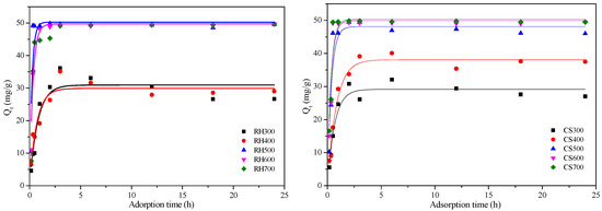 Figure 5 shows the results of the Cd2+ adsorption kinetics for both types of biochar samples obtained at various pyrolysis temperatures. The Cd2+ adsorption trends were consistent, regardless of the type of biochar, with initial rapid adsorption followed by decreased adsorption, whose equilibrium was reached after 6 h. This was due to the mass-transfer driving force induced by the Cd2+ concentration gradient existing between the liquid and solid phase (i.e., the solution and the biochar), and also the adsorption sites available on the biochar surface [38]. At the start of adsorption, the Cd2+ concentration gradient between the two phases was larger, resulting in a greater driving force for mass transfer and a greater adsorption rate. As the adsorption time increased, the Cd2+ concentration gradient decreased, and the adsorption sites on the biochar surface became saturated, resulting in intragranular diffusion becoming dominant. This intragranular adsorption rate was relatively slower. Therefore, the adsorption rate decreased and tended towards the adsorption equilibrium [39]. The higher the pyrolysis temperature, the longer the saturation time became, and the larger the adsorbent amount became, shortening the time required to reach said equilibrium. As such, the system with sample RH700 reached the equilibrium in less than 1 h, while sample CS700 achieved 99.32% of Cd2+ removal within 0.5 h. This was a direct consequence of the increased specific surface area of the biochar with increasing pyrolysis temperature, pH, and the number of surface charges [29].