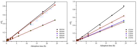 In order to better evaluate the rate-limiting step and mechanism during the adsorption process, we used pseudo-first-order kinetics (Figure 6) and pseudo-second-order kinetics (Figure 7) models to fit the data (Table 4). From the results, we can see that the pseudo-second-order kinetics model provided a better fit, with a coefficient of determination, R2 ≥ 0.990. This model, therefore, better reflected the Cd2+ adsorption process for the rice-husk and cotton-straw biochar. In the reaction rate, the adsorption rate constant (K2) indicates the speed of the adsorption process. The higher the K2 value gets, the faster the adsorption becomes, and the shorter the time required to reach the equilibrium. With increasing pyrolysis temperature, the adsorption rate for the rice-husk and cotton-straw biochar gradually increased. However, the K2 of biochar produced at 700 °C was smaller than expected. Biochar made from both materials at 600 °C afforded the maximum adsorption rate, with RH600 and CS600 values of 9.09 × 10−4 mg·g−1·h−1 and 7.58 × 10−4 mg·g−1·h−1, respectively. From Table 4, the amount of Cd2+ (qm) adsorbed with rice husk biochar following the second-order kinetics model was highest for sample RH300 at 103.13 mg·g−1, although it was only 22.62 mg·g−1 for RH600. In contrast, the lowest amount of Cd2+ adsorbed by the cotton-straw biochar was 110.29 mg·g−1 for sample CS700.
