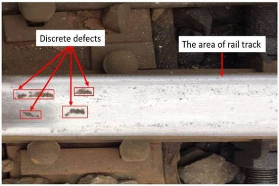 Rail transportation plays a significant role in the development of economic and industrial growth, and the failures of railway facilities (such as defects on the rail surface) are directly related to catastrophic accidents [1]. With the development of high-speed and high-load rail transit, the probability of rail surface defects is increasing rapidly. In general, rail surface defects which include corrugations and discrete defects due to wheel-rail contact conditions are the most common forms of defects [2]. Corrugations arise from periodic slip of the wheel on the rail as trains run on tracks [3]. The discrete defects are generated on the rail surface in an apparently random manner, i.e., without periodic characteristics, as shown in Figure 1. Those defects might cause serious accidents, or may even result in a catastrophic derailment of vehicles. Thus, this paper mainly discusses the detection of surface discrete defects.