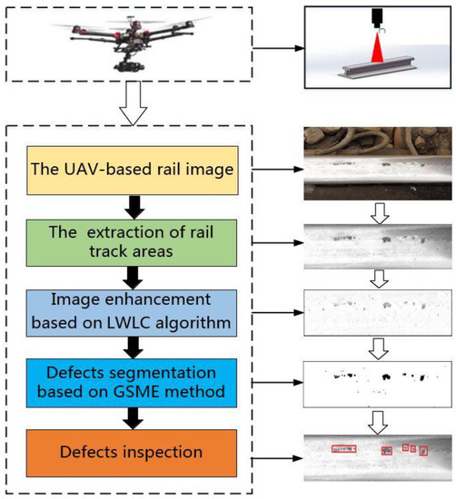 The inspection method for rail surface defects based on UAV images is proposed in this paper. The UAV-based rail images are captured by UAV equipped with a high-definition camera. The customized image processing methods are applied to analyze and detect these images. The flow diagram of inspection method for rail surface defects based on UAV image in the study is shown in Figure 2. All images used for this paper are captured by a UAV equipped with HD cameras, with the aircraft was flying at an altitude of 30 m above the rail. There are three subjects discussed in this section: (1) the extraction of area of rail tracks; the pseudocode of the tracks extraction is presented in the appendix, (2) UAV-based rail images enhancement based on LWLC algorithm, and (3) the defects segmentation based on the GSME method.