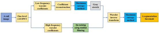 Based on one-level 2-D DWT algorithm, the rail image is decomposed into four bands (LL, HL, LH, HH). For the LL band, the ME algorithm is used to obtain a segmentation threshold after reconstructing its coefficient, and then the gray stretch method is used to enhance contrast between background and foreground. For HL, LH and HH bands, the median filtering template of horizontal line, vertical line, and diagonal line is used to eliminate noise of three high frequency wavelet coefficients, respectively.