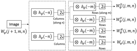 The 2-D DWT diagram for an image by using digital filters and down-sampling. An original 2-D image can be decomposed into four sub-image: a scaling component and three wavelet components, , , and . In Figure 7, denotes convolution symbol, denotes low pass filter, and denotes high pass filter.