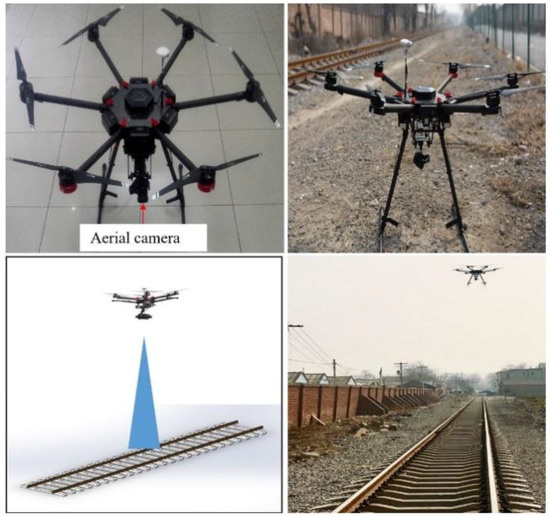 As shown in Figure 6, the DJI Matrice 600 equipped with Zenmuse Z30 (DJI-Innovations, Shenzhen, China) was used to capture rail images. The Matrice 600 is a six-rotor flying platform designed for professional aerial photography and industrial applications. The aircraft uses six Intelligent Flight Batteries to extend the time of flight. The built-in API Control feature, expandable center frame, and maximum takeoff weight of 15.1 kg make the Matrice 600 ideal for connecting other devices to meet the specific needs of different applications. The Zenmuse Z30 enables non-contact distance detection by a high-performance camera system with a zoom lens. This aerial camera offers 30× optical zoom, 6× digital zoom, and HD 1080P video. The UAV adopts an industrial level Zenmuse platform with a precision of 0.01 degrees, so the problem of image blur caused by jitter is effectively solved.