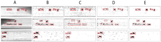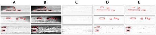 Examples of four defect segmentation methods for rail surface images. (A) Three examples of extracted rail images. (B) Three examples of defect segmentation by LWLC+ME method. (C) Three examples of defect segmentation by LWLC+GSTA. (D) Three examples of defect segmentation by MLC+PEME method. (E) Three examples of defect segmentation by LWLC+GSME method. In Figure 10, the discrete defects on images have been marked by red rectangle to compare enhancement performance of LWLC+GSME method with related methods.