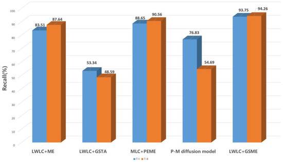 Comparison of defection recall for four detection methods. The blue block and orange block denotes T-I defect and T-II defect, respectively.