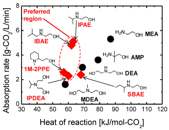 Relationships of absorption rate and heat of reaction between conventional and synthesized amines employed for CO2 absorbents. Solid circles (