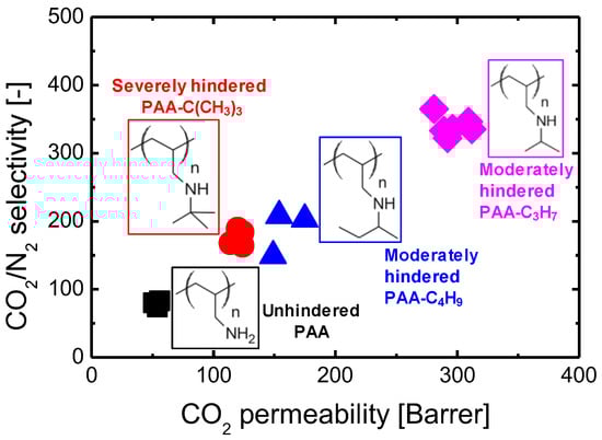 Sterically hindered amines (SHAs), as originally defined by Sartori and Savage, can be identified from either of the following: (i) a primary amine in which the amino group is attached to a tertiary carbon atom or (ii) a secondary amine in which the amino group is attached to at least one secondary or tertiary carbon atom [29]. Based on this definition, it is difficult to identify tertiary amines with small bulkiness. In this review, we regard tertiary amines as SHAs due to their similar performance. Unlike unhindered amines, SHAs are characterized by the formation of carbamates with intermediate-to-low stability due to the bulkiness of the substitutions attached to the amino groups. In this way, SHAs may provide a faster reaction with CO2 while they lower the heat of reaction. As such, membranes with SHAs might proceed with CO2 transport (adsorption-hop-desorption) more effectively across the membrane thickness. In addition, as shown in Equations (3) and (4), humidity or water vapor is also an important factor that impacts the CO2 transport behaviors within amine-containing membranes, which might make it more complicated to investigate the role of amine type in CO2 transport behaviors. The effect of humidity on CO2 transport behaviors was therefore excluded in this review.