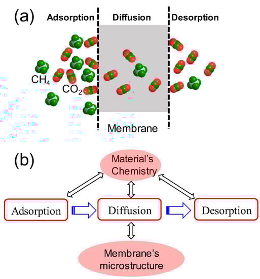 Schemes of (a) CO2 separation through a membrane and (b) the factors impacting CO2 transport behaviors including adsorption on the membrane surface, diffusion across the membrane thickness, and desorption from the membrane permeate surface.