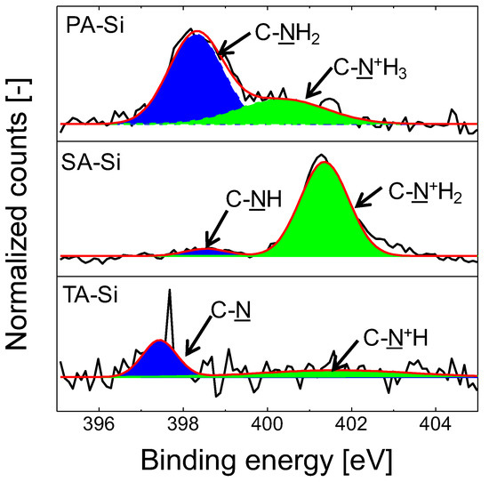 The N1s spectra of amine-silica xerogel powders fired at 250 °C under N2 (black line, original peak; red line, fitted peak). Reproduced from ref. [22] with permission. Copyright (2017), Elsevier.