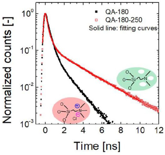 PALS data for quaternary ammonium-silica films fabricated on silica wafers, as recorded at a positron incident energy level of 1.2 keV. QA-180: Trimethyl[3-(trimethoxysilyl)propy]ammonium chloride-derived film fired at 180 °C; QA-180-250: Trimethyl[3-(trimethoxysilyl)propy]ammonium chloride-derived film fired at 180 °C before post-heat-treatment at 250 °C. Both samples were fired under a N2 atmosphere, so was the post-heat-treatment. Reproduced from ref. [23] with permission. Copyright (2017), John Wiley and Sons.