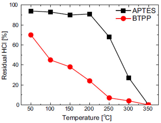 Residual Cl content in amine-silica xerogel powders as a function of post-heat-treatment temperature (N2 atmosphere, 30 min). Reproduced from ref. [22] with permission. Copyright (2017), Elsevier.