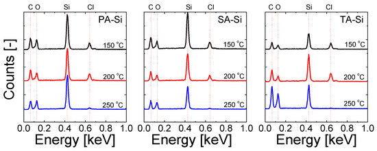 EDS profiles of amine-silica xerogel powders as a function of post-heat-treatment temperature (N2 atmosphere, 30 min). Reproduced from ref. [22] with permission. Copyright (2017), Elsevier.
