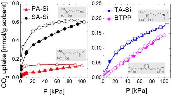 CO2 adsorption/desorption isotherms at 35 °C for amine-functionalized organosilica xerogel powders. The solid symbols represent the adsorption data, and the open symbols show desorption. Results were reorganized from refs. [21,22].