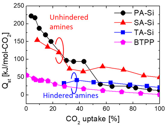 Isosteric adsorption heat of CO2 for amine-functionalized organosilica xerogel powders calculated from adsorption isotherms. Adsorption isotherms measured at 35, 45 and 55 °C were adopted for the calculation and the values of CO2 uptake were normalized using each maximum adsorption capacity (at 100 kPa) as a standard. Results were reorganized form refs. [21,22].