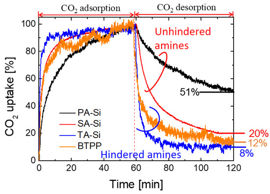 Time course of normalized CO2 adsorption amount for the 1st cycle of a CO2 adsorption/desorption process for amine-functionalized organosilica xerogel powders performed on TG/DTA equipment. A 60 vol% of CO2 in a CO2-Ar mixture with a flow rate of 50 cm3/min and a total pressure of 100 kPa was adopted for the CO2 adsorption process, while pure Ar with the same flow rate and pressure was used for CO2 desorption process. The samples were activated by heating at 200 °C for 12 h, followed by cooling to 35 °C under a pure Ar atmosphere. Results were reorganized from refs. [21,22].