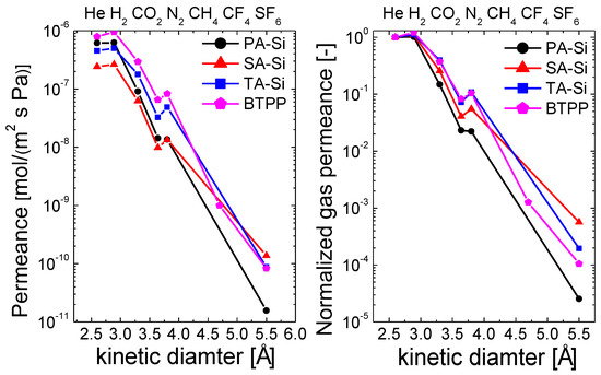 Kinetic diameter dependence of gas permeance (left: actual permeance; right: normalized permeance) operated at 200 °C for amine-functionalized organosilica membranes. The gas permeances were normalized based on their He permeances as standards. Results were reorganized from refs. [21,22].