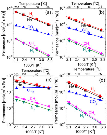 Temperature dependence of gas permeance for amine-functionalized organosilica membranes: (a) PA-Si; (b) SA-Si; (c) TA-Si; and (d) BTPP. Results were reorganized from refs. [21,22].