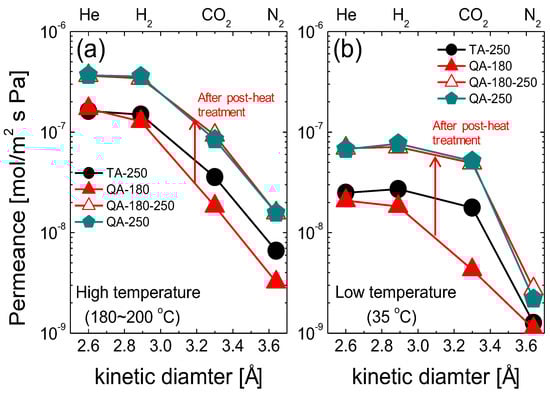 Kinetic diameter dependence of gas permeance for QA-Si derived membranes fired at different temperatures and performance comparison with TA-Si derived membranes at both (a) high and (b) low temperatures. Gas permeation test of QA-180 fabricated with a calcination temperature of 180 °C was performed at 180 °C and 200 °C for the remaining three membranes. Reproduced from ref. [23] with permission. Copyright (2017), John Wiley and Sons.