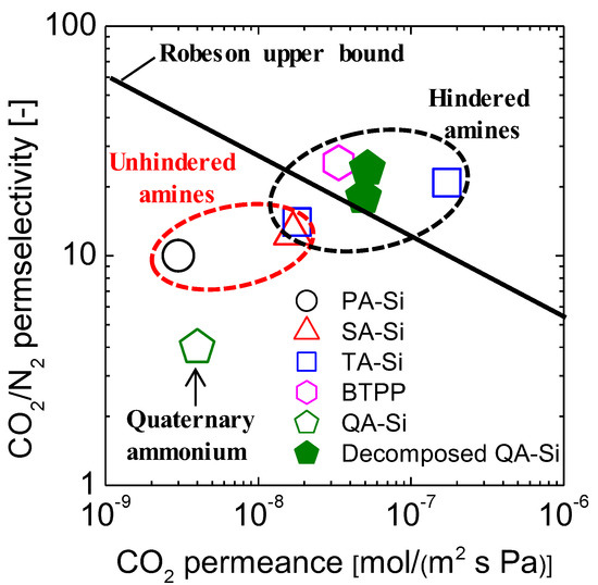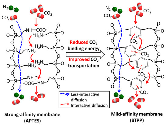 The ever-increasing rate of greenhouse gas emissions in the atmosphere, particularly CO2 generated from the combustion of fossil fuels, has led to serious global climate concerns. Therefore, efficient CO2 capture technologies such as absorption/adsorption of CO2 sorbents, cryogenic separation, and membrane separation, have been developed experimentally and industrially over the past few decades. Among them, membrane technology is attracting growing attention owing to its inherent advantages that include energy-efficiency, ease of operation and scale-up, and a small footprint [1,2,3,4,5]. As one of the most important members of the membrane family, organosilica membranes have been applied to various membrane processes with superior separation performance and a high tolerance to harsh conditions. Typical organosilica membranes developed for CO2/N2 separation are either microporous with rigid pores or nonporous with “free-volume” pores. Separations are therefore achieved mainly by the effect of molecular sieving along with partial contributions from selective surface diffusion through rigid pores and/or solution-diffusion within a nonporous structure. The selectivity is always less arresting due to the comparable kinetic diameters of CO2 (3.3 Å) and N2 (3.64 Å) and due as well to the difficulty in precisely controlling the pore (rigid or free-volume type) sizes. Given this, various amine-functionalized silica-based membranes have been developed to accomplish CO2 separation from gas mixtures with potentially enhanced efficiency [6,7,8,9,10,11,12,13]. These membranes are expected to show great potential in simultaneously promoting CO2 permeance and permselectivity due to the reversible reactions between CO2 and amine groups. Thus far, however, only a limited number of membranes have offered appealing CO2 separation performance with both high CO2 permeance and CO2/gas permselectivity irrespective of many reports of amine-functionalized silica-based membranes. Instead, in some cases even reverse CO2/N2 selectivity under a dry state has been observed [13]. Whereas, in some cases, other types of membranes with only CO2-philic groups rather than chemical reactions, such as poly(ethylene oxide)-based membranes, have resulted in attractive CO2 separation performance [2]. Hence, further fundamental studies in terms of the effect of amine-CO2 chemical interactions on CO2 transport behaviors through amine-functionalized silica-based membranes are needed to direct the fabrication of high-performance CO2 separation membranes.