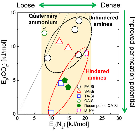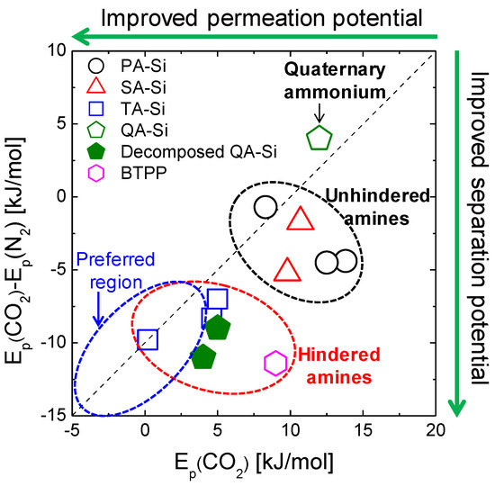 Relationships of Ep(CO2) vs. Ep(CO2) − Ep(N2) for amine-functionalized organosilica membranes. The preferred region shown in the figure demonstrates lower values for both Ep(CO2) and Ep(CO2) − Ep(N2). Results were reorganized from refs. [21,22,23].