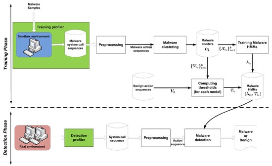 dynamically detects polymorphic malware based on system calls. It comprises two main phases: the training phase and detection phase. Figure 1 shows the architecture of the  method. In the following subsections, we describe each of these phases in detail.