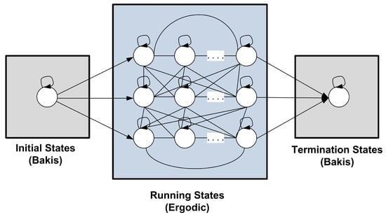 HMM topology: We define the topology of HMMs based on program behavior. Recall that each program consists of three main stages at runtime: (1) initialization; (2) running; and (3) termination. In the initialization stage, each program sets its variables by initial values and allocates its required resources. Thus, we consider this stage as following the serial Bakis topology. In the running stage, programs perform some iterative units of work in the form of conditions and loops. Thus, we consider this stage as following the parallel fully connected (ergodic) topology. The termination stage is somewhat similar to the initialization stage: it publishes the program outputs, deallocates the resources, and terminates the program. Thus, we consider this stage as following the Bakis topology. Figure 2 expresses the novel program behavior-aware HMM topology where the number of states at running stage should be determined.