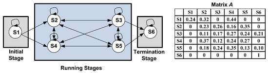 A six-state program behavior-aware HMM topology and its corresponding transition probability matrix A.