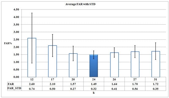 In the hierarchical clustering method, we plot the reconstruction error as a function of k and look for an elbow. Then, we set k at elbow.  denotes the set of all candidate k values that points to the one of the elbow points. In , the principle rule is to select the smallest possible k that leads to set of suitable HMMs. We select the smallest k such that: (1) ; and (2) there is only at most one cluster  where its members are not similar enough and has just few action sequences. Note that, according to our experience on HMM, if the average similarity of a cluster is less than 0.5, then the corresponding HMM is not converged accurately and leads to a high false alarm rate.