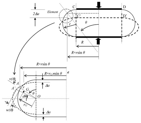 Considering w(θ) as the relevant displacement to characterize the shell distortion, the incremental work ΔU performed by the internal pressure against a prescribed displacement Δa at both flanged ends is evaluated by the variation of the shell volume. For this, the static moment of an elementary triangle defined by points {A A’ O} with reference to the axis of revolution e must be calculated. Then, the volume of the shell is obtained with the theorem of Pappus–Guldin (in the book of Tom M. Apostol [6]) and integrating the following function for the meridian angular variable θ in interval [0, π]: