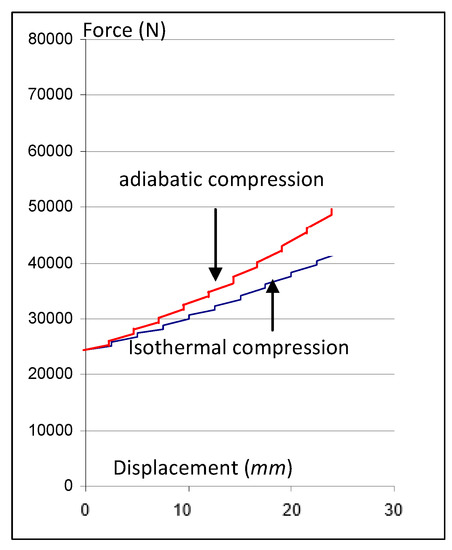 On compressing the bellows up to half of the initial volume, by the thermodynamics law of perfect gases, the final pressure should be twice the initial one with an isothermal process, and about 2.5 times that with an adiabatic variation; however, this relation does not apply due to the additional air volume of the torus shell membrane, where its variation is not linearly proportional to the axial displacement, as with the ideal cylinder joining both end flanges of the bellows spring (Figure 2 and Figure 3). Differences are assigned, for example, to the variation of the isothermal compression force from 25 KN to 42.5 KN and in the adiabatic compression reaching 47.5 KN, when the shell is compressed to half of its initial height.