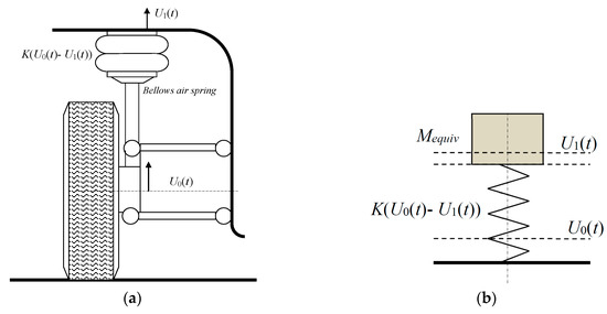 In this simplification, the equivalent mass is a part of the total vehicle mass depending on its distribution by the axles. For each wheel, the dynamic model of the automotive suspension can be represented with good accuracy as a SDOF system, provided that the displacement field can be assigned to a dominant value at a defined point. This is the case of the wheel hub, considering the tire stiffness is much larger than the suspension spring, practically transmitting the entire displacement from the road profile to the wheel hub and to the spring end. As indicated in Figure 6b, the base (road) prescribes a displacement U0(t) to the wheel axle (assuming here that the elasticity of the tire is much larger than the spring one), while the equivalent mass M of the vehicle body is displaced U1(t). The dynamic equilibrium of the spring/mass model of Figure 6b is: