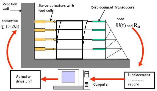 Figure 7 shows a sketch of a conventional test rig in the simulation seismic loads, where the operating principles of the method are summarized. A rigid reaction wall receives the thrust from the actuators when prescribing a displacement vector to the test specimen. In seismic engineering, it is desirable that full-scale test specimens should be used in dynamic analysis, as reduced scales may not realistically evidence the damage models, given the lesser accuracy in transposing the mechanical properties of the real-size structure material to the one used in reduced-scale test specimens.