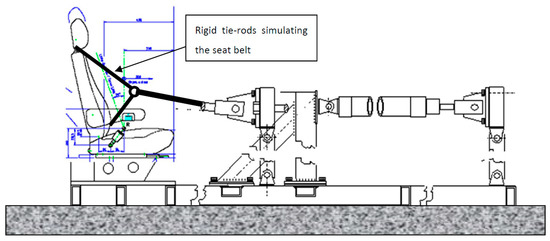 Despite these drawbacks, an apparently favorable feature of the method in the scope of automotive engineering was found by the authors in using a test rig (Figure 8) that was designed for the certification of automobile seats by pseudo-dynamic simulation of the passenger/seat interaction in a crash test analysis (Carneiro et al. [12]). Thanks to the sequenced/incremental process in the test specimen deformation, the progressive collapse of the seat fixing accessories (such as bolts, rivets, and welded joints) could be observed with some detail on setting a pause to the structure deformation and recommencing it when desired. The test rig schematically represented in Figure 8 was a more elaborate version of the one presented by Pinto et al. [12]; however, it was not published, as it was still in development and tests at the date of the present paper’s publication [11].