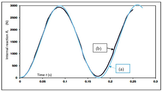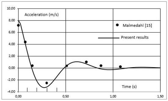 A step force was applied to the suspension system at instant t = 0; thereafter, the force was steady and stable. The force selected was quantified after setting the initial acceleration a0 = 8 ms−2, at t = 0. Malmedahl [13] probably chose the trigger instant for acceleration time start not necessarily at t = 0, but rather slightly anticipated, as shown in Figure 8. The external impulsive force was computed from the initial acceleration as F0 = Ms × a0(t = 0) = 340 × 8 = 2720 N.