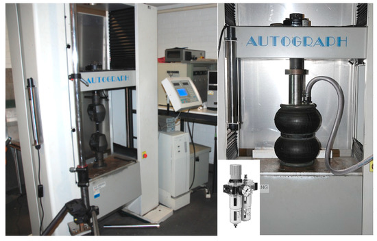 Mounting of the bellows pneumatic accessory in a SHIMADZU® testing machine between the working table and upper crosshead with an adaptor ram and a pressure air control unit.