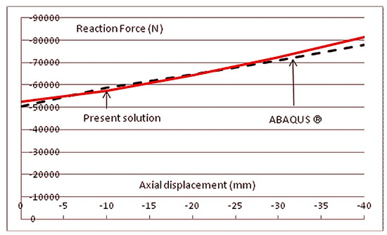 Spring response from prescribed axial displacements with the presented method and ABAQUS® (Axisymmetric shell elements with ABAQUS®, with geometry similar to the previous example but initial pressure = 4 bar).