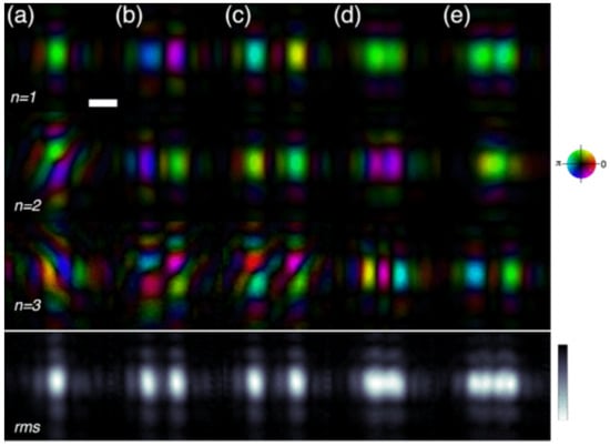 The first three ( n = 1, 2, 3) recovered probe modes for the cases of (a) a static sample; (b) a square wave with amplitudes m and (c) m; and (d) a sine wave with amplitudes m and (e) 1.5 m. The bottom line also shows the square root of the summed intensity (rms, right column, linear scale) from five probe modes for the cases listed previously. The rms shows clearly how the probe forms can be manipulated using a vibrating sample. The scale bar is 1 m. The vibration frequency is selected to be 1 Hz with exposure of 6 s per position. Figure adapted from Ref [9], reprint permission granted, 2014 American Physical Society.