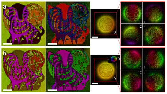 Two different sets of reconstructions from the same data set using different initial guesses. (a) The first set of raw reconstructions; (b) The second set of raw reconstructions. The scale bars indicate a length of 300 m. The color wheel applies to all the images. To aid in display, the curvature of the probe phases has been removed. Figure adapted from [10], Reprint permission granted, 2016 The Optical Society.