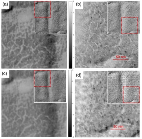 Specimen reconstructions. (a,b) The phase and modulus of the specimen when 16 modes were engaged; (c,d) The phase and modulus reconstructed with a single mode. The main images are the magnification of the squared area by the red dashed line in the whole field of view inserted in the top corner. Figure adapted from Ref [14]. Reprint permission granted. 2016 American Physical Society.