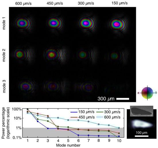 The top panel shows the three reconstructed illumination modes with the most powers for diffraction pattern collected at different scan speeds. The bottom panel shows the power percentage of the recovered modes. With increased scan speed, more illumination power is removed from primary modes and redistributed into other modes. The inset in the bottom-left corner shows the propagation of the reconstructed illumination wave back to pinhole plane. The shape and dimension are consistent with SEM measurement of the pinhole. Figure adapted from Ref [15]. Reprint permission granted. 2015 Macmillan Publishers Ltd.