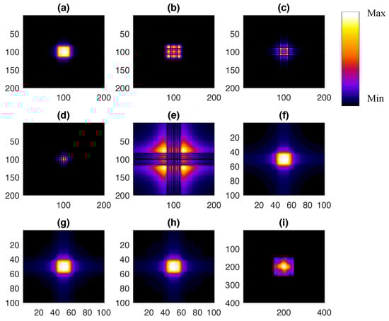 Five first fundamental modes (a–e) from SVD of a real-only Lena image; (f–h): simulated sum of 5 modes; 10 modes and 20 modes. (superposition of central part of mode Figure 7a–e); (i) reconstructed sum of 5 modes of object. (superposition of central part of mode Figure 7a–e); The colormap is the same as that in Figure 6. The Figure 7i is reconstructed results of Figure 7f. The minima and maxima of colormap legend bar for Figure 7a–i are as follows respectively: [0, 0.7764]; [−0.3369, 0.3452]; [−0.3694, 0.3241]; [−0.3410, 0.3031]; [−0.3161, 0.3273]; [0.6184, 6.0942]; [0.5684, 6.1781]; [0.5845, 6.3456]; [0, 12.2898].