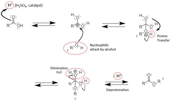 The esters were synthesized based on Fischer esterification process with H2SO4 as a catalyst. Under acidic conditions, the oxygen from the carbonyl group is protonated, thus creating a partial positive charge on the carbon, which is more prone to be attacked by the nucleophilic alcohol. Water is then formed by proton transfer and eliminated. Upon deprotonation of the carbonyl oxygen, the double bond is formed again to create the resulting ester group. Since the reaction is an equilibrium based on Le-Châtelier principle, it can be shifted towards the products (ester) by working with an excess of alcohol under refluxing conditions [20]. The reaction mechanism is shown in Figure 1.