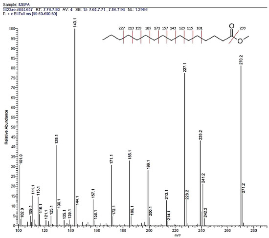 Following GC characterization, a mass spectra of the self-produced MEPA was registered to further confirm the molecular structure (Figure 5). The peak from the molecular ion was observed at 270.2 m/z with high abundance, as reported in literature for linear long-chained alkane systems [24]. From there, the cleavage of the methanol group was visible from the peak at 239 m/z, corresponding to a loss of 31 of the methyl molecule (15 m/z) and alcohol atom (16 m/z). Side resonances at 241 and 242 are thought to be due to resonance forms of the methoxy group. From 227 m/z to 101 m/z several peaks distanced 14 m/z each (227, 213, 199, 185, 171, 157, 143, 129, 115, 101) show the progressive breaking of the aliphatic chain by loss of -CH2 from the acid side. Hence, the overall structure of MEPA was confirmed.