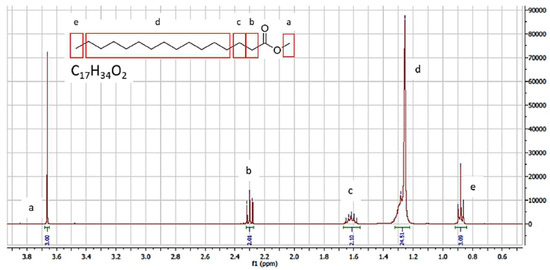 With regards to NMR results, the spectra of self-produced MEPA with 1:5 acid:alcohol ratio and 5 h heating time was fully characterized, and the structure and purity confirmed. At 3.66 ppm (a), a singlet arising from the protons of the deshielded methyl group –CH3, which resonated as a singlet due to lack of neighbouring protons, was visible. The normalized area of the peak was assigned a value of 3 to correctly calculate the amount of protons in the spectra recorded. At 2.28–2.32 ppm (b), a triplet with area 2 from the –CH2 in α-position to the carbonyl, and a multiplet between 1.58–1.65 ppm (c) with area 2 from the –CH2 in β-position to the carbonyl was seen. The –CH2 in α-position resonated as a triplet due to proximity with the two protons from the the –CH2 in β-position, and appeared to be more de-shielded due to the neighboring carbonyl group. An intense peak corresponding to 24 hydrogen atoms resonating together was observed around 1.26 ppm (d), and was assigned to the long aliphatic chain from the fatty acid. Lastly, the –CH3 group at the end of the aliphatic chain appeared as a triplet with integrated area of 3 at 0.86–0.90 ppm (e) due to strong shielding effect and distance from the carbonyl group and electro-withdrawing elements. By summing the integrated areas values of the peaks assigned, a total of 34 hydrogens were obtained, which matched the elemental composition C17H34O2 of MEPA (Figure 6). No impurities were observed, thus confirming the results obtained from GC-MS spectral data. Therefore, it could be concluded that commercial MEPA had been successfully replicated in the laboratory with high purity, and new esters could be produced through the Fischer esterification procedure reported above.