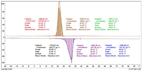 Following structural and purity analysis, thermal characterization was performed by TGA and DSC to determine thermal stability (thermal degradation, cycling), melting and crystallization points Tm and Tc, degree of supercooling and enthalpy of fusion ΔH of commercial and self-produced MEPA. Commercial MEPA presented an average onset Tm of 28.2 °C ± 0.2 °C, and Tc of 25.3 °C ± 0.1 °C in accordance to what was stated by the provider, and a supercooling of 2.9 °C for 10 °C/min heating rate. The melting and crystallization peaks were calculated by the STARe software through the tangent method, and the enthalpies were obtained by integration of the corresponding peak. The standard deviations were calculated from the results of the cycling tests and repetitions. For determination of phase change temperatures, onset temperatures are reported, and supercooling is calculated as the difference between onset melting temperature and onset crystallization temperature, unless stated otherwise. A high ΔH of 204 J/g ± 2 J/g was observed for commercial MEPA, indicating its suitability as PCM for LHS applications. As can be seen from Figure 7, synthesized MEPA presents phase change temperatures in accordance with the commercial sample with melting temperature of 26.3 °C ± 0.0 °C and crystallization temperature of 24.2 °C ± 0.2 °C, same degree of supercooling and stability over three heating/cooling cycles. The enthalpy of fusion observed from integration of the corresponding peak amounted to 201 ± 1 J/g, indicating a high degree of purity in the MEPA produced, thus confirming once again the results previously reported.