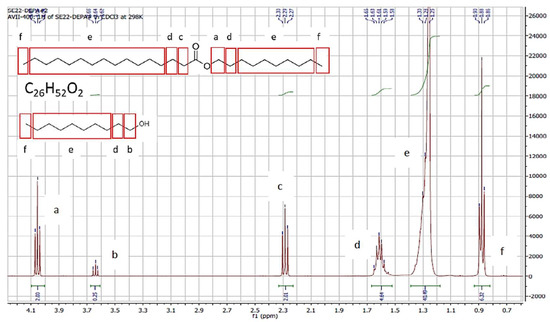 Similarly, the structures of the different esters could be easily identified through 1H NMR analysis, as well as detection and quantification of impurities from residual alcohol or acid (Figure 10). All the 1H NMR spectra of methyl esters showed a high degree of purity and no residual alcohol, therefore their purity was estimated at ≥98%. The same main peaks as the ones observed in the spectra of replicated MEPA were observed, namely the singlet at 3.66 ppm from the deshielded methyl group –CH3 directly attached to the carbonyl group, the triplet at 2.28–2.32 ppm from the –CH2 in α-position to the carbonyl, the multiplet from the –CH2 in β-position at 1.58–1.65 ppm, the peak from the alkane chain around 1.26 ppm and the triplet at 0.86–0.90 ppm from the shielded –CH3 group at the end of the aliphatic chain. On the other hand, some variances in the spectra for decyl esters allowed differentiation between the diverse groups of esters. Here, a triplet with integral value of 2 instead of a singlet appeared at 4.05–4.07 ppm (a) from the –CH2 in α-position to the oxygen of the ester group. This is due to the fact that in 1-decanol, unlike in methanol, the aliphatic chain continues, therefore the –CH2 in α-position feels the influence of the neighboring –CH2. The triplet at 2.28–2.32 ppm (c) from the –CH2 in α-position to the carbonyl group remained the same, while the multiplet at 1.58–1.65 ppm (d) from the –CH2 groups in β-position had an integral equal to 4 hydrogens instead of 2 due to the presence of the additional –CH2 in β-position to the oxygen from the alcohol side. Similarly, the peak from the alkane chain at 1.26 ppm (e) had an integral value of about 38 hydrogens, and the triplet at 0.86–0.90 ppm (f) corresponded to the 6 hydrogens from the shielded –CH3 at the end of the aliphatic chains from the acid and the alcohol sides. Small alcohol impurities, when present, were visible in the form of a triplet at 3.62–3.66 ppm (b) from the –CH2 in α-position to the hydroxy group of the free alcohol molecules.