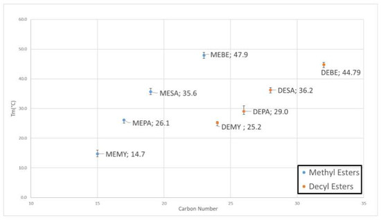 Methyl esters and decyl esters both show a correlation between Tm and Tc and carbon chain length, but following different behaviors; this is believed to be due to the odd-even effect [17,18,19,20,22,23]. The acid carbon chain length seems to have higher impact than the alcohol.