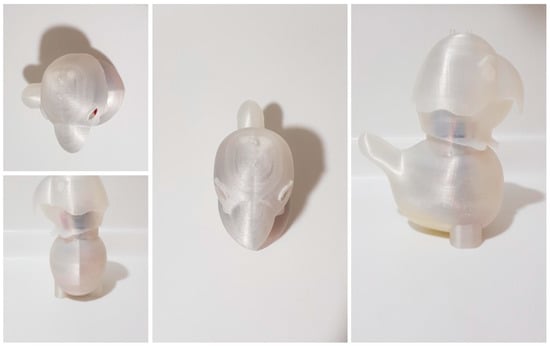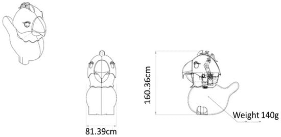 After a series of brainstorming sessions on concept generation and selection sessions, we developed a wearable pet robot KiliRo centered on achieving 180 degrees of rotating head design. The curvature of the robot’s leg design was optimized to create a wearable robot design. The dimensions and weight of the robot played a vital role in the wearable robot design, as the wearers wore them in most cases. The dimensions of KiliRo-W and the selection of commercial devices, such as servo motors, electronic boards, etc., were opted to fit the robot design constraint on size and weight. The robot has three parts: head, body, and wings. The neck part connects the head and body. A static tail is attached at the top of the head for aesthetic appeal. The feet were designed through inspiration from parrots and were modified to adapt to the wearable design, which can fix to the body part. The robot parts were designed to be hollow to minimize the weight and optimize the three-dimensional printed materials. The specifications of the mechanical properties of the wearable parrot robot are listed in Table 1.